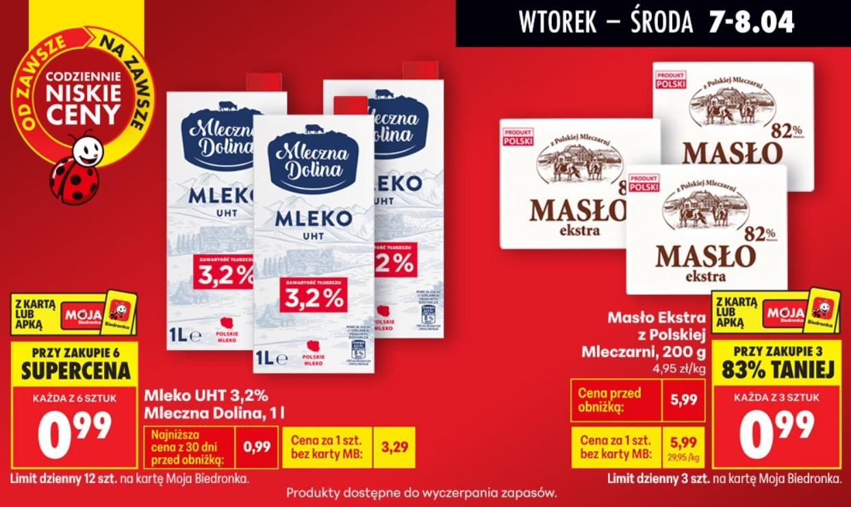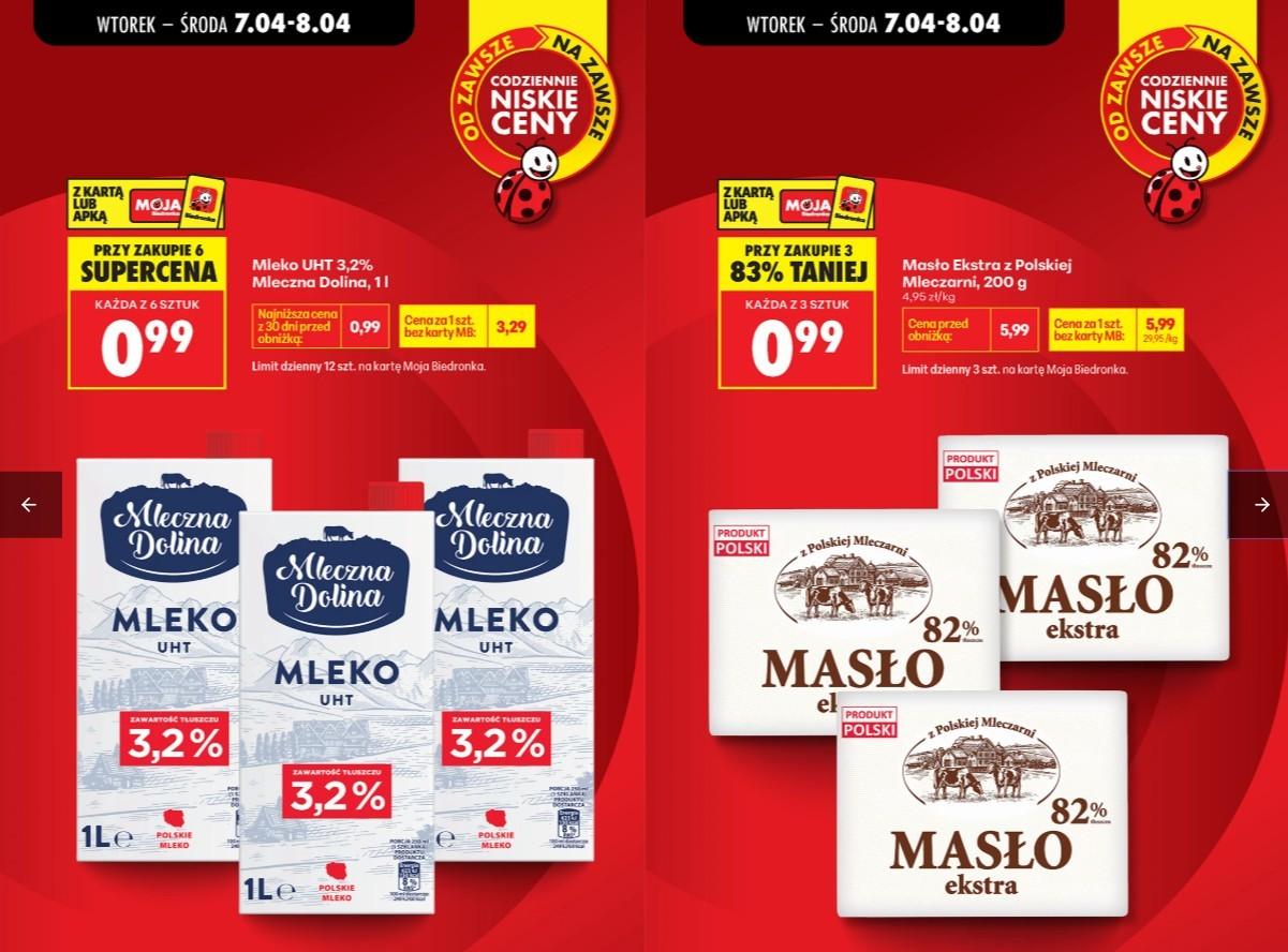 Chodzi o promocję w sieci Biedronka, gdzie przez dwa dni (7 i 8 kwietnia) można kupić kostkę masła za 0,99 zł (przy zakupie trzech sztuk) oraz litr mleka UHT 3,2% za 0,99 zł (przy zakupie sześciu sztuk).