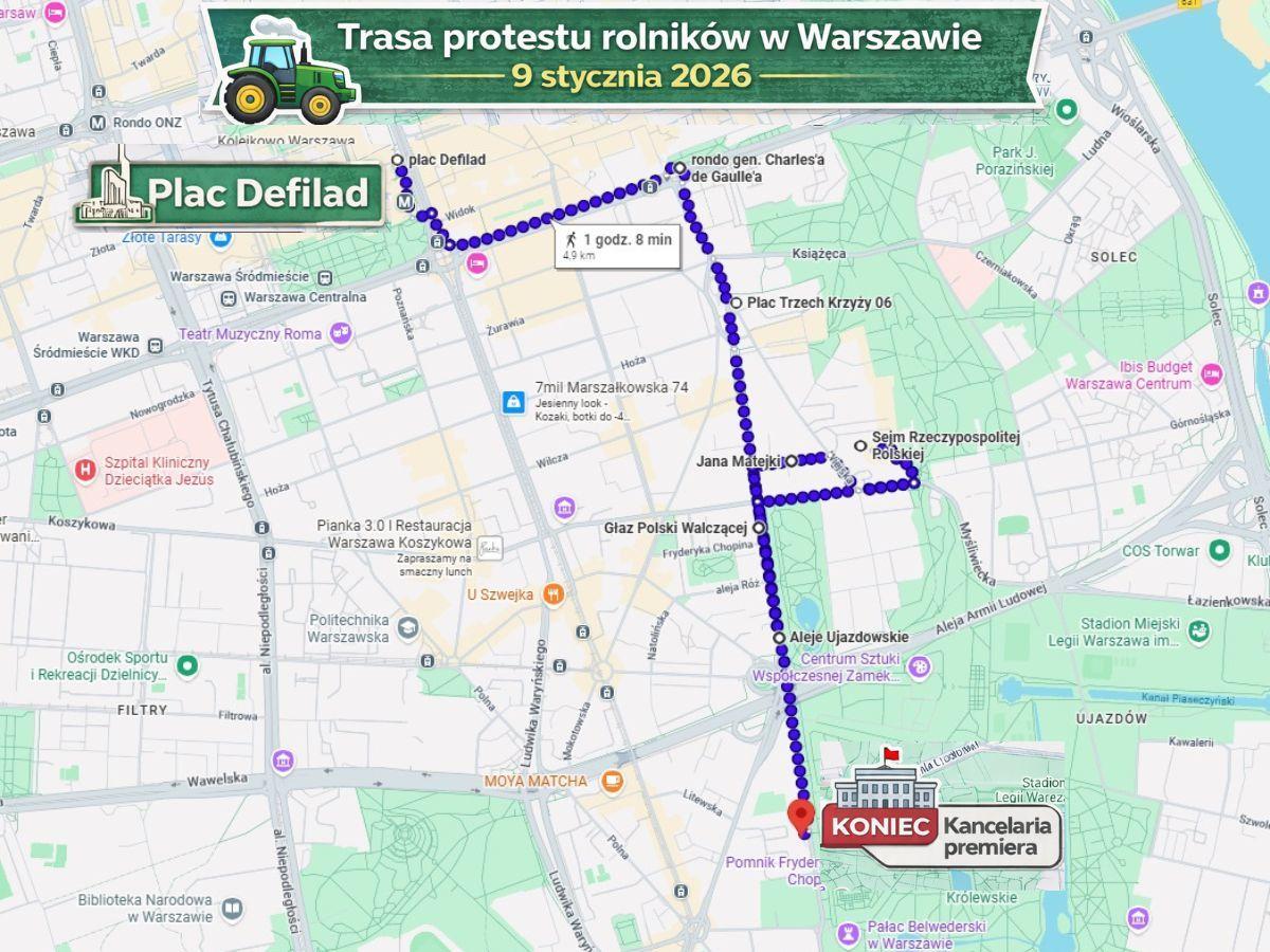 Protest rozpocznie się w piątek 9 stycznia o godz. 11.00 na placu Defilad w Warszawie, pod Pałacem Kultury i Nauki. Rolnicy przejdą następnie: