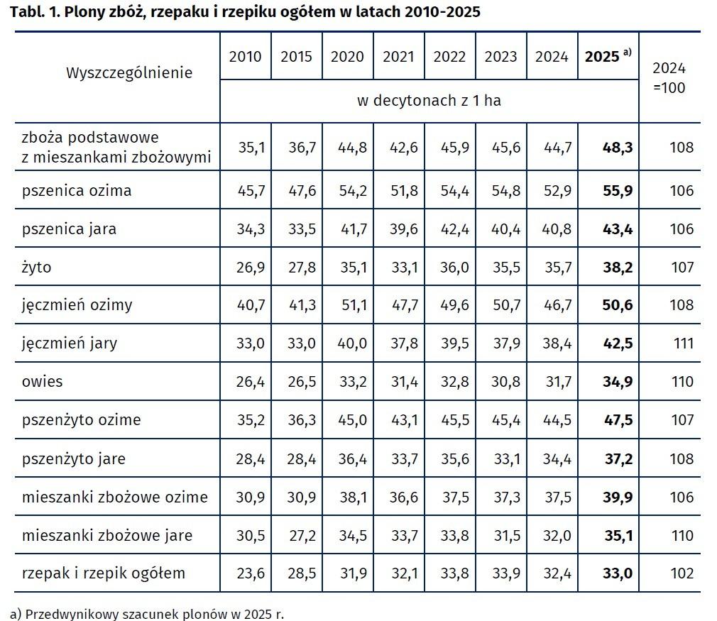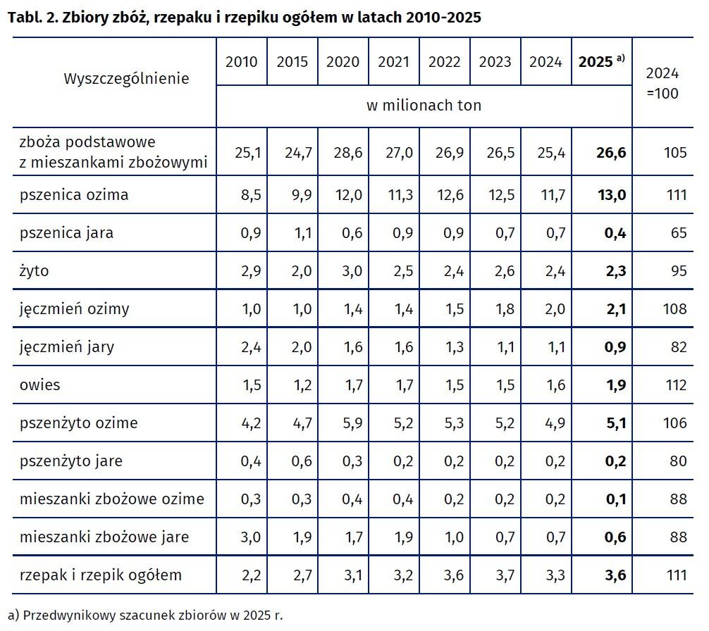 GUS zwraca uwagę, że na podstawie prowadzonych szacunków, ocenia się, że powierzchnia uprawy zbóż ogółem w 2025 r. jest niższa niż przed rokiem i wynosi ok. 7,0 mln ha, w tym powierzchnia zasiewów zbóż podstawowych z mieszankami zbożowymi – ok. 5,5 mln ha, z tego: