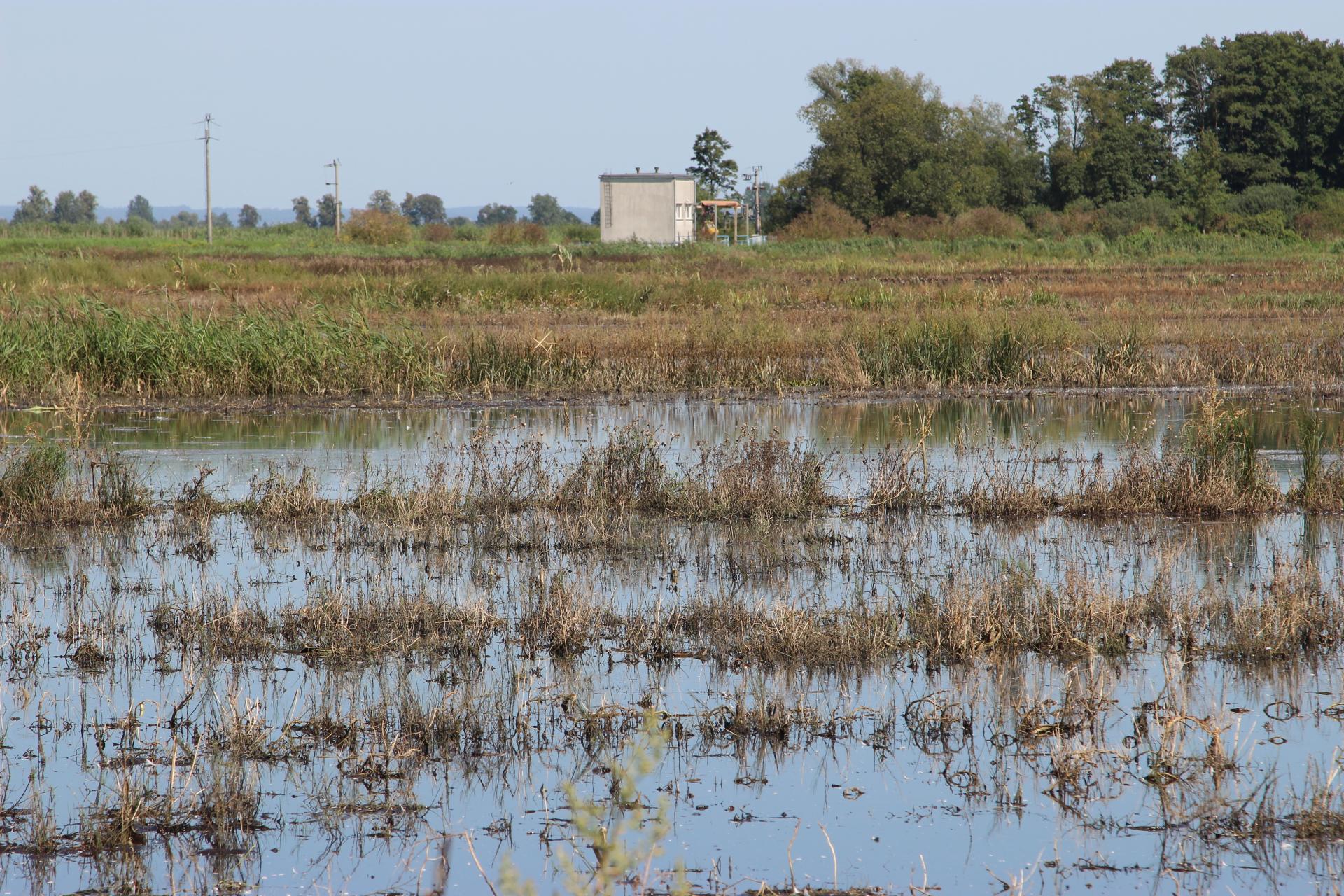 Skutki zalań na Żuławach Elbląskich. W tle stacja pomp