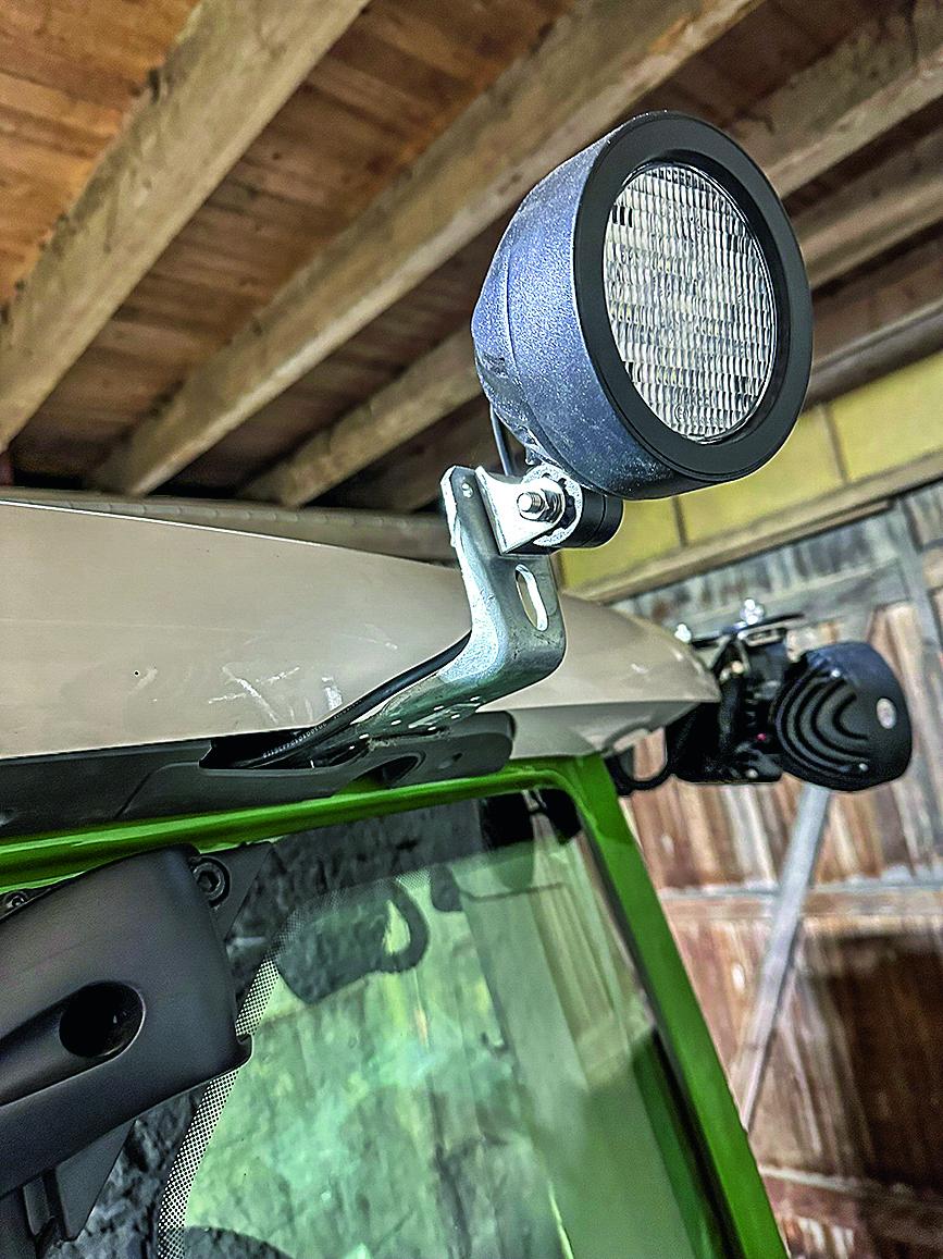 Wykorzystał w tym celu instalację od obrotowych lamp błyskowych. Modernizacja dotyczy ciągnika, który pracuje głównie w obejściu, więc „kogut” nie jest koniecznym wyposażeniem. Rolnik zdemontował fabryczne uchwyty lamp błyskowych i zamontował uchwyty własnej konstrukcji, do których przykręcił lampy. Po wciśnięciu przycisku lamp błyskowych oświetlana jest przestrzeń z lewej i prawej strony ciągnika. Rolnik wykorzystuje dodatkowe oświetlenie głównie do pracy ze ścielarką w obszarach obory, gdzie brakuje naturalnego światła.