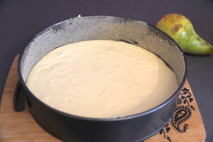700 ml kremówki ubij z 2 łyżkami cukru. Dodaj 500 g serka mascarpone i zmiksuj na gładki krem. Czwartą gruszkę obierz, zetrzyj na drobnych oczkach i dodaj do śmietanowej masy.