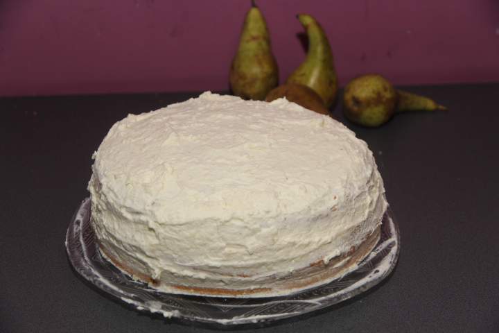 Biszkopty przełóż smażonymi gruszkami i kremem.