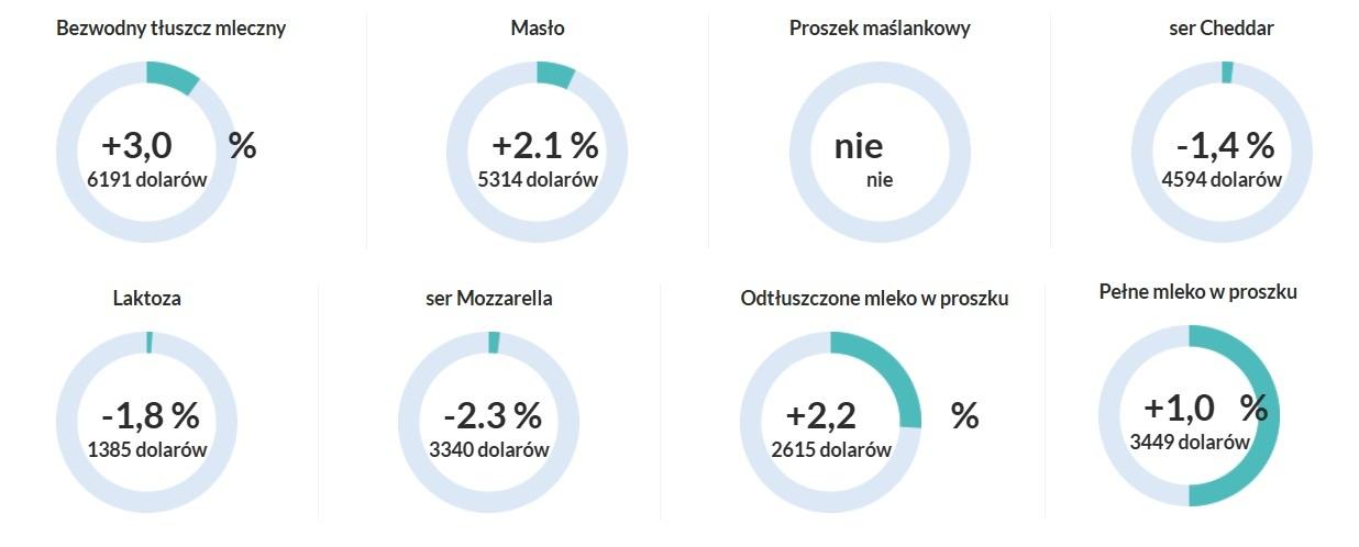 Ceny odwodnionego tłuszczu mlecznego, masła, pełnego mleka w proszku (WMP) oraz odtłuszczonego mleka w proszku (SMP) wzrosły. Powodem jest spowolnienie produkcji mleka surowego w Oceanii po szczycie sezonu oraz wzrost popytu eksportowego przed Chińskim Nowym Rokiem i Ramadanem.