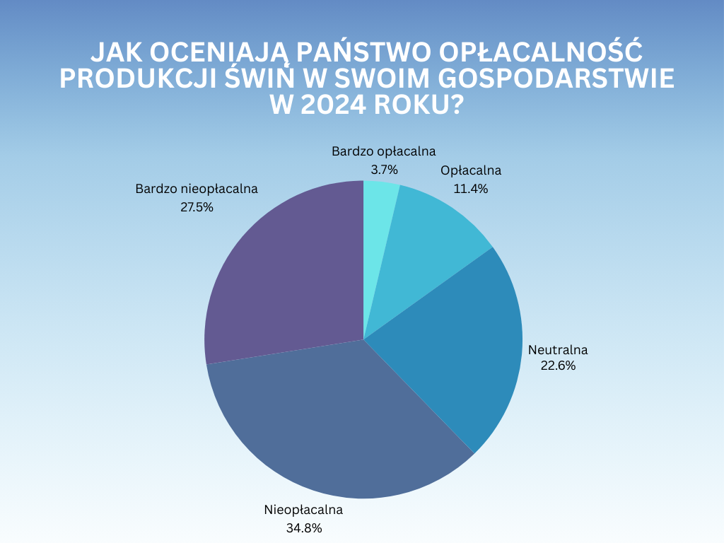 Łącznie ponad 60% twierdzi, że w zeszłym roku nie zarabiali na świniach. Ponad dwie trzecie rolników uważa, że w 2024 roku hodowla świń była nieopłacalna (34,8%) lub bardzo nieopłacalna (27,5%). Tylko 11,4% ankietowanych oceniło jej rentowność jako opłacalną, a 3,7% za bardzo opłacalną. Co piąty producent (22,6%) przyznał, że sytuacja finansowa gospodarstwa nie przyniosła ani zysków, ani strat.