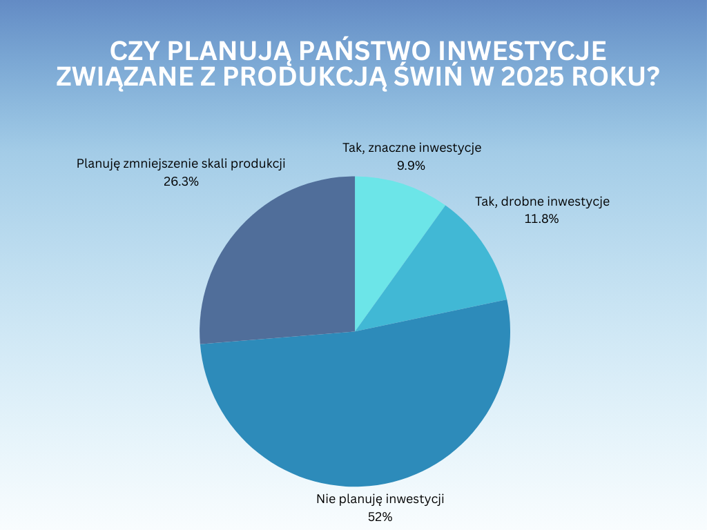 W związku z trudną sytuacją na rynku wieprzowiny wielu hodowców rezygnuje z dalszych inwestycji w swoje gospodarstwa. Ponad połowa (52%) deklaruje, że w 2025 roku nie planuje żadnych inwestycji, a co czwarty hodowca (26,3%) zamierza wręcz ograniczyć skalę produkcji. Drobne inwestycje planuje 11,8% ankietowanych, a tylko co dziesiąty hodowca (9,9%) przewiduje znaczne inwestycje, takie jak modernizacja gospodarstwa czy wdrożenie nowych technologii.