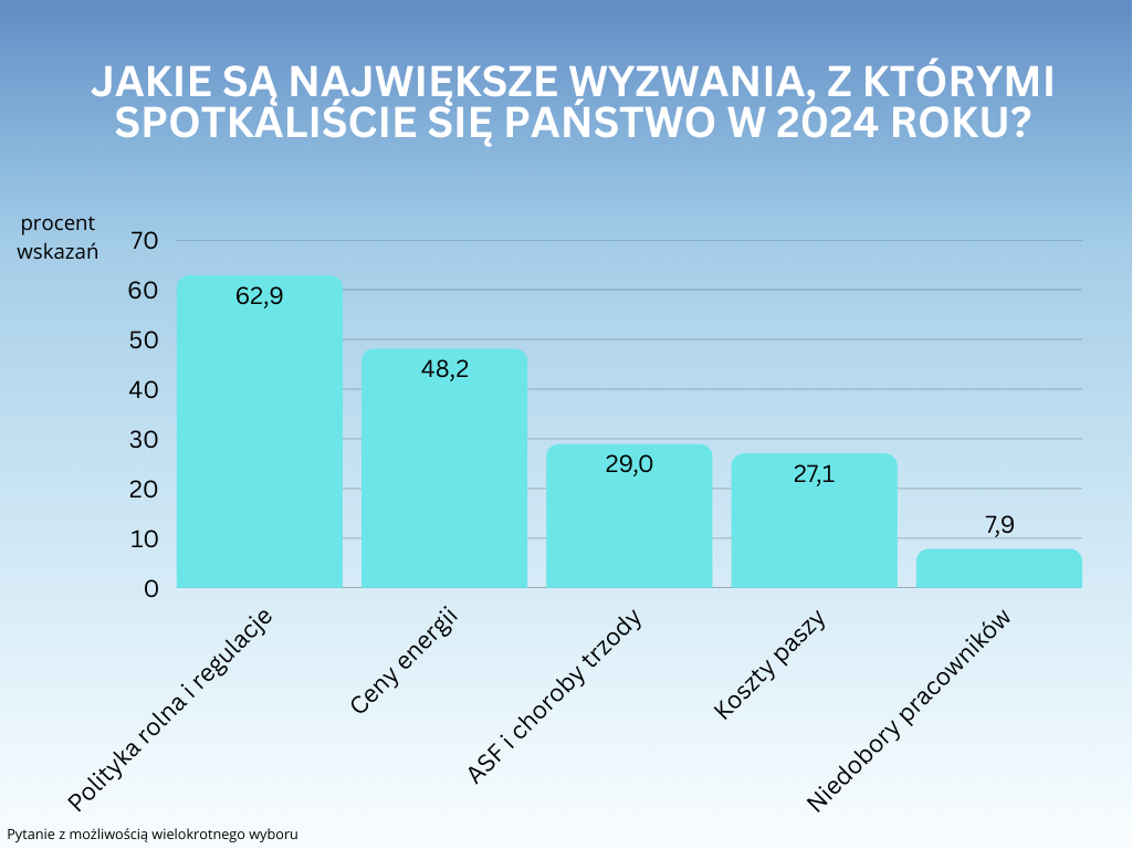 Aż 48,2% ankietowanych wskazało na wysokie ceny energii jako kluczową barierę rentowności, a 27,1% na drożejącą paszę. Ponadto 29% respondentów za poważny problem uznaje ASF i inne choroby trzody, które destabilizują produkcję. Jednak największym wyzwaniem według 62,9% rolników pozostaje polityka rolna i regulacje, które w ich ocenie nie sprzyjają rozwojowi sektora. Dodatkowo 7,9% hodowców zwraca uwagę na problem niedoboru pracowników.