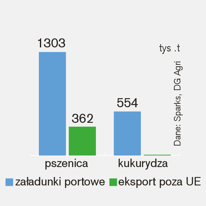 Podobne załadunki portowe i dużo mniejszy eksport poza obszary UE pozwalają stwierdzić, że rośnie aktywność eksportowa prowadzona mniejszymi statkami przewożącymi naszą pszenicę do innych portów Wspólnoty Europejskiej.