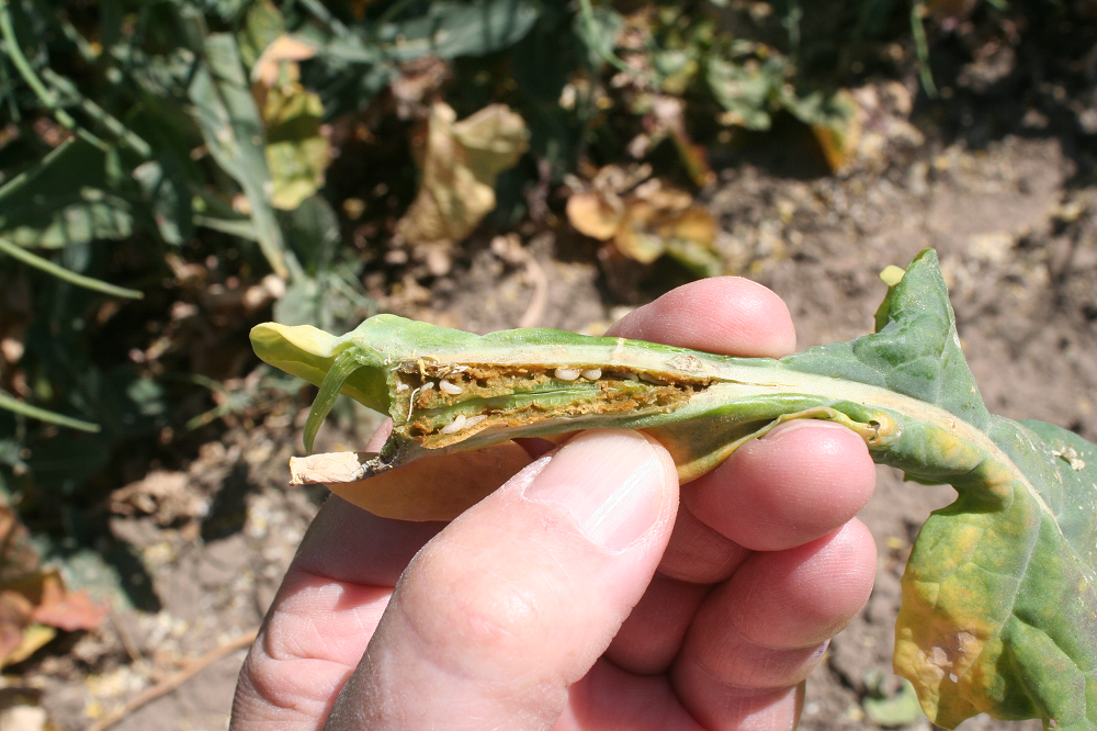 Obecnie można zaobserwować w jednym liściu od 2–3 larw do nawet 6–10 szt. na odcinku zaledwie 5 cm, co oznacza, że na jednej roślinie może żerować od kilkudziesięciu do nawet ponad 100 larw!