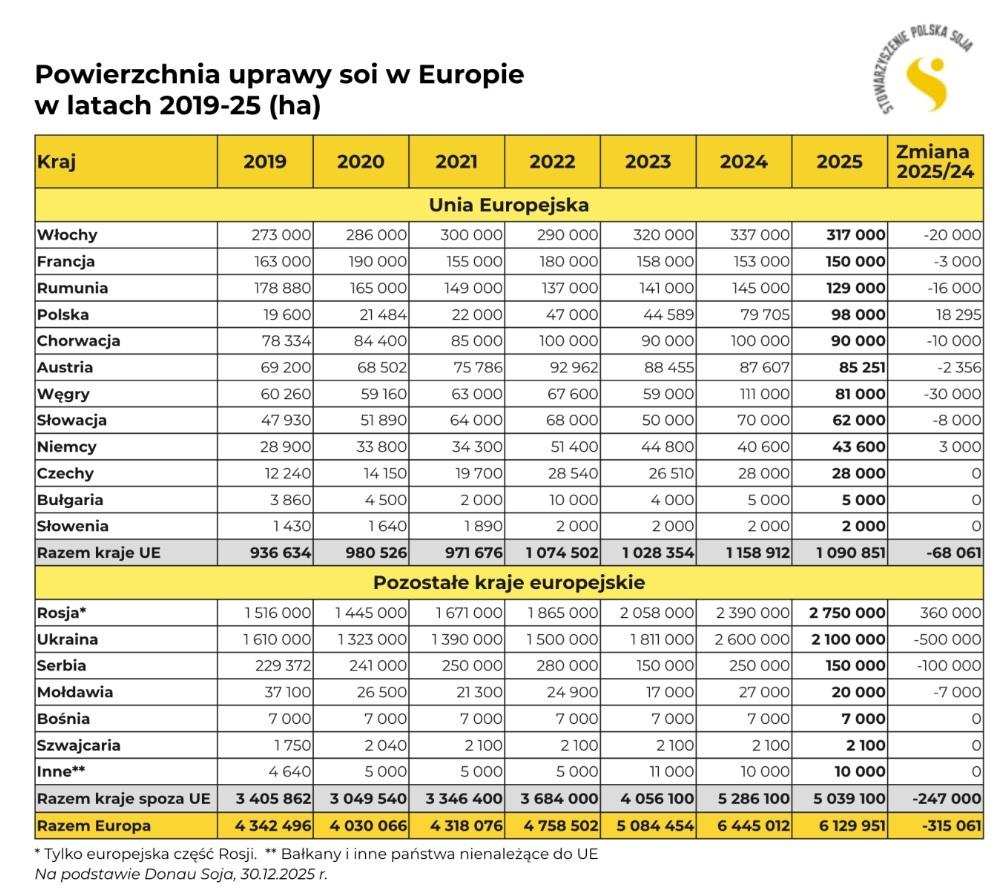 Potwierdzają to dane dotyczące produkcji soi w Europie opublikowane na koniec 2025 r. przez Donau Soja.