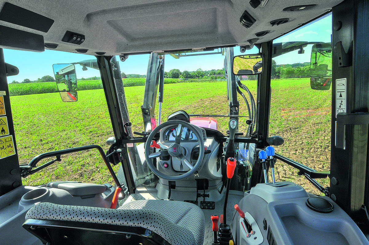 Wsiadanie do kabiny z lewej strony jest wygodne, z prawej uniemożliwia je masywny wspornik od dźwigni sterowania ładowaczem czołowym. Kierownica i deska rozdzielcza odchyla się, niestety po użyciu dźwigni, a nie pedału. Lusterko zewnętrzne z lewej strony odchyla się do tyłu, nawet gdy dotknie się nim drobne gałęzie.