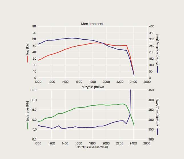 Zaletą ciągnika jest stosunkowo długi zakres utrzymywania w ryzach zużycia paliwa. Minimalne jednostkowe zużycie paliwa, równe 260 g/kWh, osiąga jeszcze silnik pracujący z prędkością 1800 obr./min.