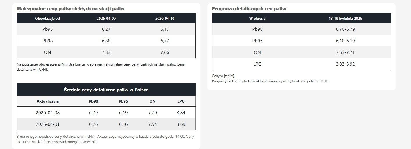 Zmiana dotyczy także cen na dzień dzisiejszy. Zgodnie z obwieszczeniem maksymalne ceny paliw na piątek 10 kwietnia wyniosą: