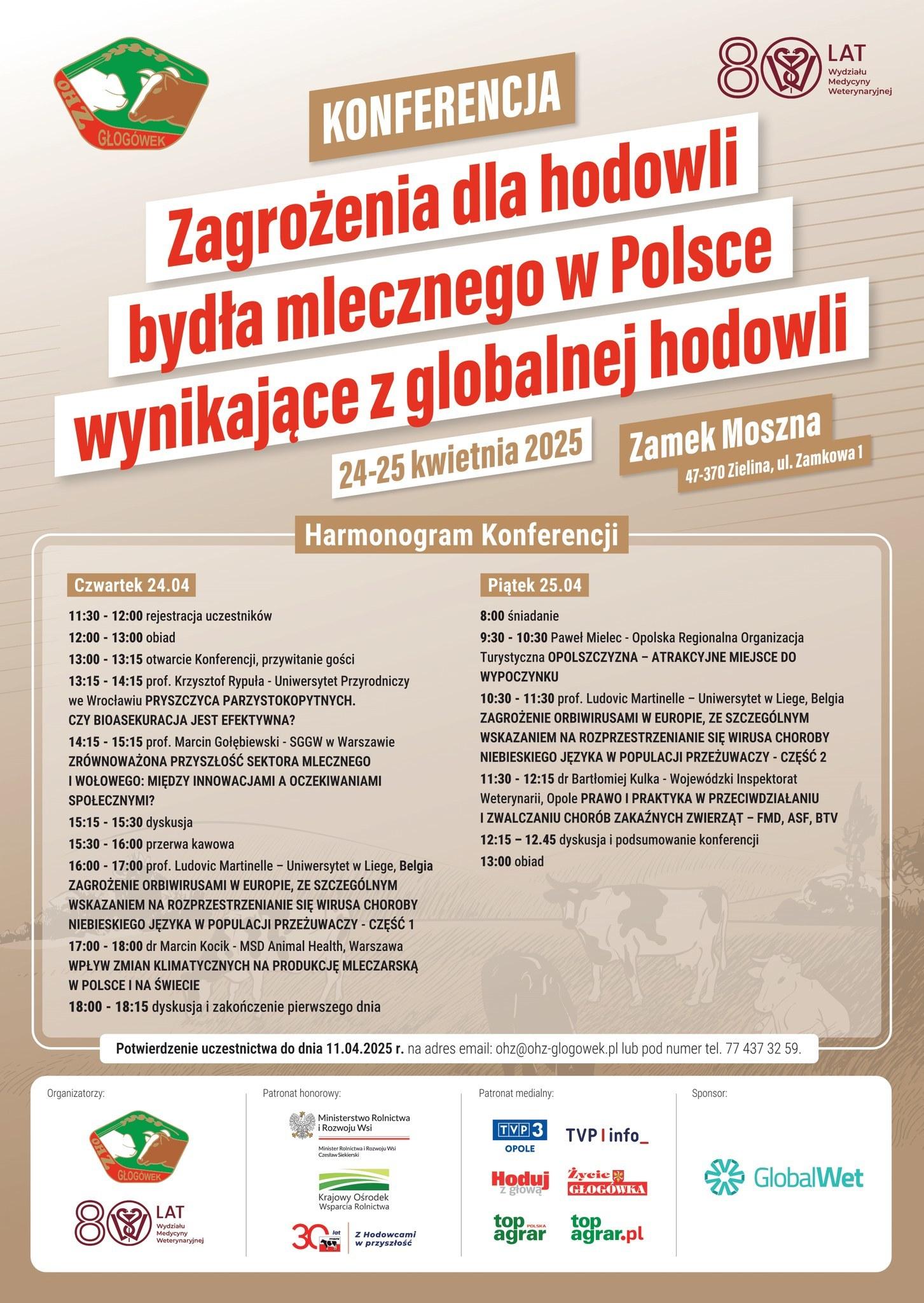 Organizatorem konferencji jest Ośrodek Hodowli Zarodowej „Głogówek” oraz Wydział Medycyny Weterynaryjnej Uniwersytetu Przyrodniczego we Wrocławiu. Organizatorzy zaprosili do udziału naukowców, hodowców, przedstawicieli branży mleczarskiej oraz organizacji wspierających rolnictwo. Wspólnie postarają się odpowiedzieć na pytanie, jak polska hodowla może odnaleźć się w realiach globalnego rynku i jakie działania warto podjąć już dziś, by zadbać o jej przyszłość, zwłaszcza w kontekście pryszczycy, choroby niebieskiego języka i innych chorób.