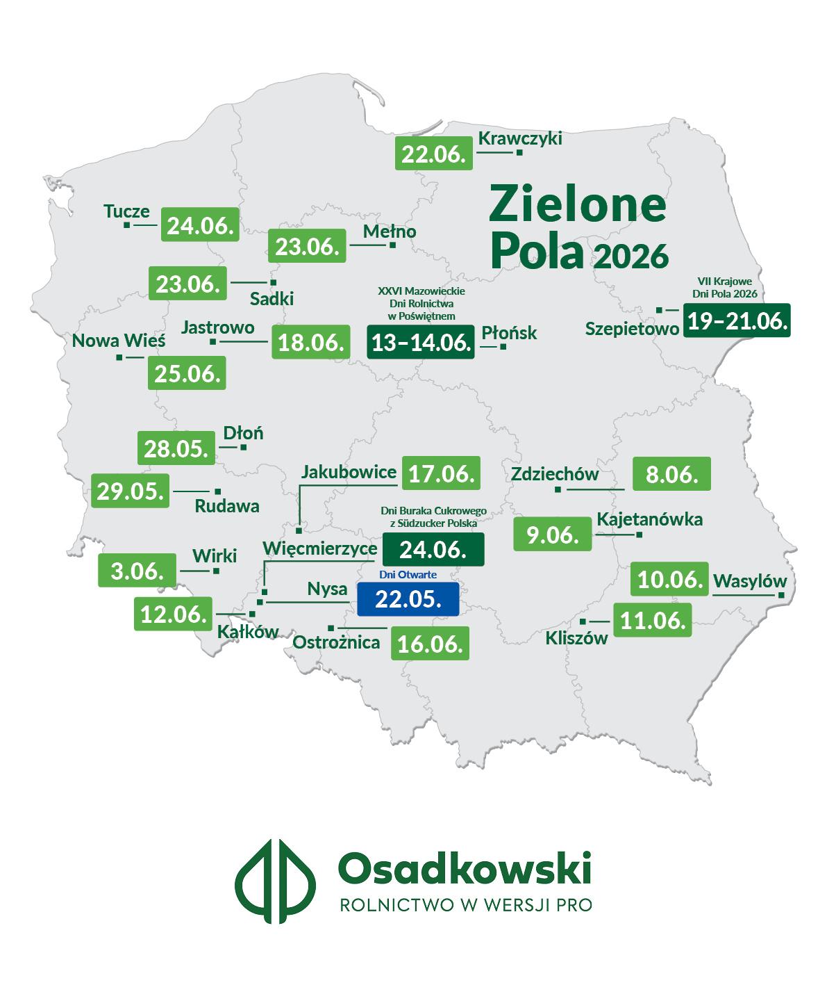 Po raz kolejny w sezonie wiosenno-letnim rusza cykl spotkań polowych Zielone Pola, organizowany przez firmę Osadkowski. Wydarzenia zaplanowano w kilkunastu lokalizacjach w całym kraju, a ich celem jest przyjrzenie się aktualnej kondycji upraw i wymiana doświadczeń bezpośrednio w polu.