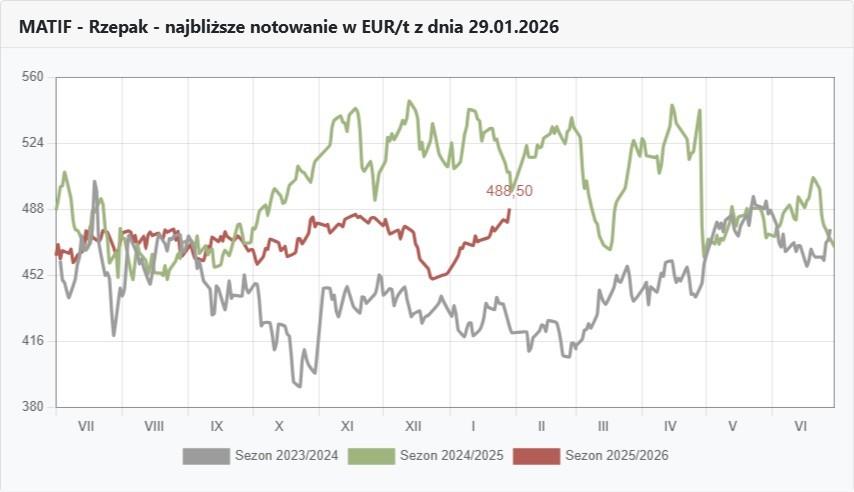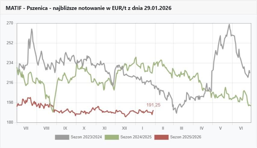 Zastanawiając się, co się może wydarzyć w lutym warto brać pod uwagę niezaprzeczalne fakty. W zeszłym roku o tej samej porze pszenica na giełdzie MATIF była o ponad 40 euro/t droższa. Dokładnie 29.01.25 r. pszenicę na marzec paryska giełda wyceniała na 232,50 €/t, a tego samego dnia bieżącego roku marcowe kursy są po 191,25 €/t.