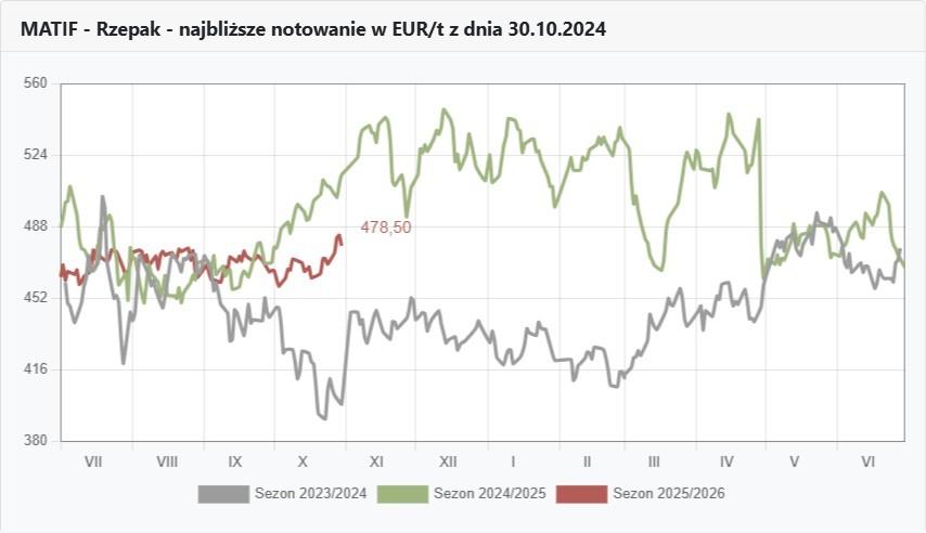 Jeśli teraz przeanalizujemy, to co zwykle dzieje się z notowaniami rzepaku na paryskiej giełdzie, to zwykle na początku listopada mamy jeszcze chwilkę wzrostów a potem mocno w dół. Ten wzrost dotyczy przeskoku z listopada na luty, a potem już sam luty podlega korektom. Z tym musimy się liczyć, gdy zbyt długo ze sprzedażą będziemy w tym okresie zwlekać.