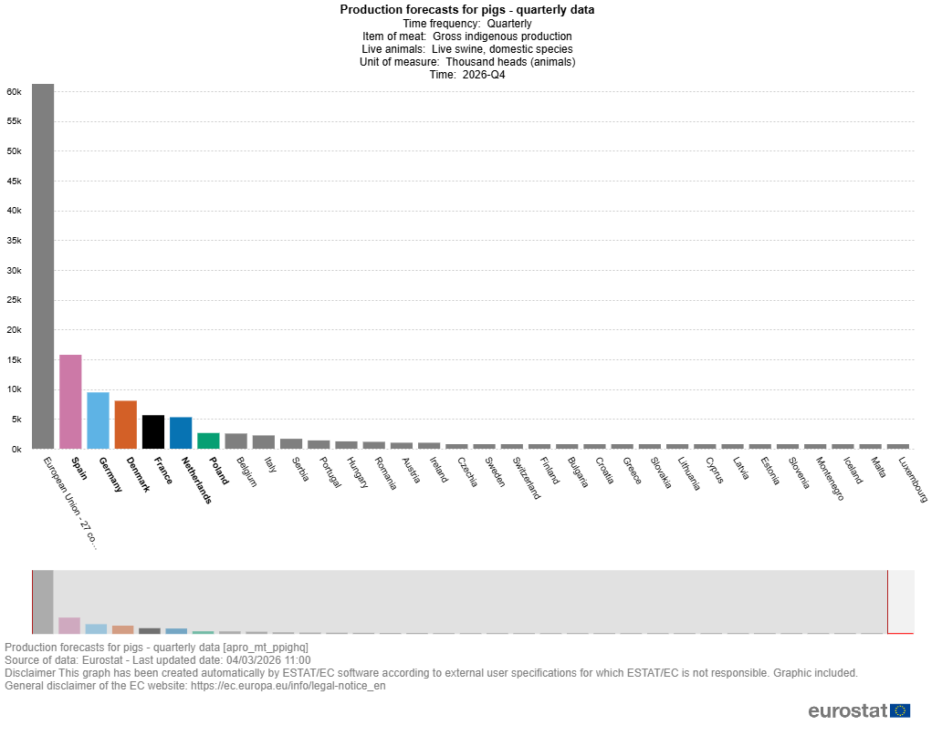 Na tym tle inaczej wygląda sytuacja w trzodzie chlewnej. Prognozy wskazują, że pod koniec 2026 r. (w IV kwartale) liczba świń w UE wzrośnie do ok. 61,2 mln sztuk. To niewielki wzrost (ok. 3%), ale ważny, bo po wcześniejszych spadkach pokazuje zmianę kierunku.