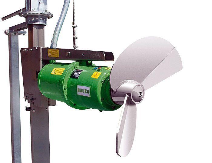 Przykładowo, mieszadło zanurzeniowe Bauer MSXH 7.5 ma trójfazowy silnik elektryczny o mocy 7,5 kW i w ciągu godziny jest w stanie wymieszać 3600 m3 gnojowicy. Maszyna wyposażona jest w 600-mm śmigło dwupłatowe, które pracuje z prędkością 315 obr./min, przekładnię planetarną czy specjalne uszczelnienie wału. Mieszadło waży niespełna 200 kg. Dla zwiększenia bezpieczeństwo mieszadło można doposażyć w zabezpieczenie przeciwwybuchowe.