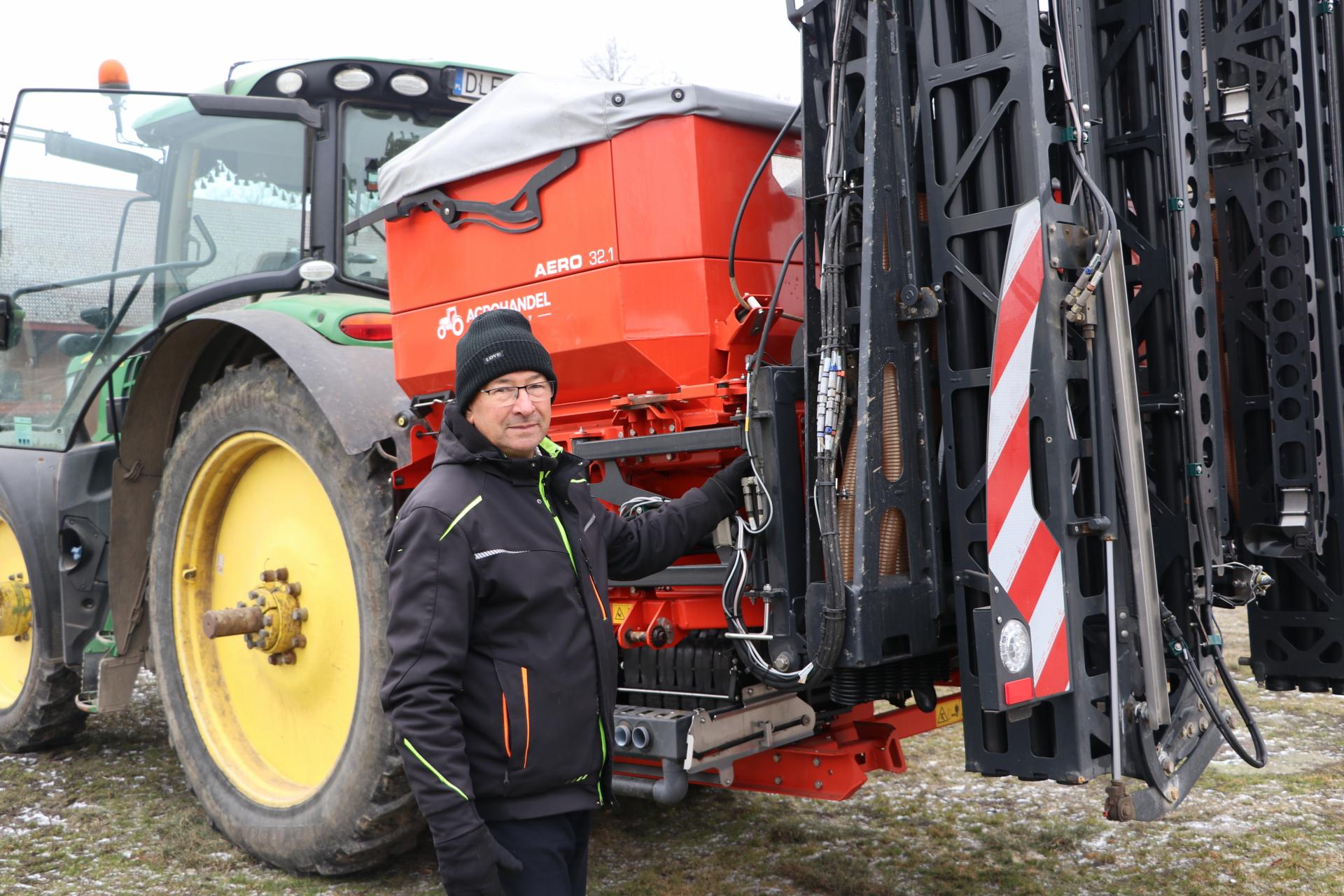 Szczególnie ciekawą maszyną jest rzadko spotykany na polskich polach rozsiewacz pneumatyczny z belką wysiewającą, który 3 lata temu trafił do gospodarstwa. Rozsiewacz Rauch Aero 32.1 ma 4 hydraulicznie napędzane aparaty wysiewające. Każdy aparat połączony jest z 6 dyszami i może być włączany lub wyłączany oraz regulowany niezależnie. Maszyna jest też wyposażona w system Distance Control, który zarządza wysokością belki polowej za pomocą czujników ultradźwiękowych. Dmuchawa napędzana jest z WOM ciągnika (1000 obr./min). Za pneumatyczny rozsiewacz rolnik zapłacił 340 tys. zł netto.