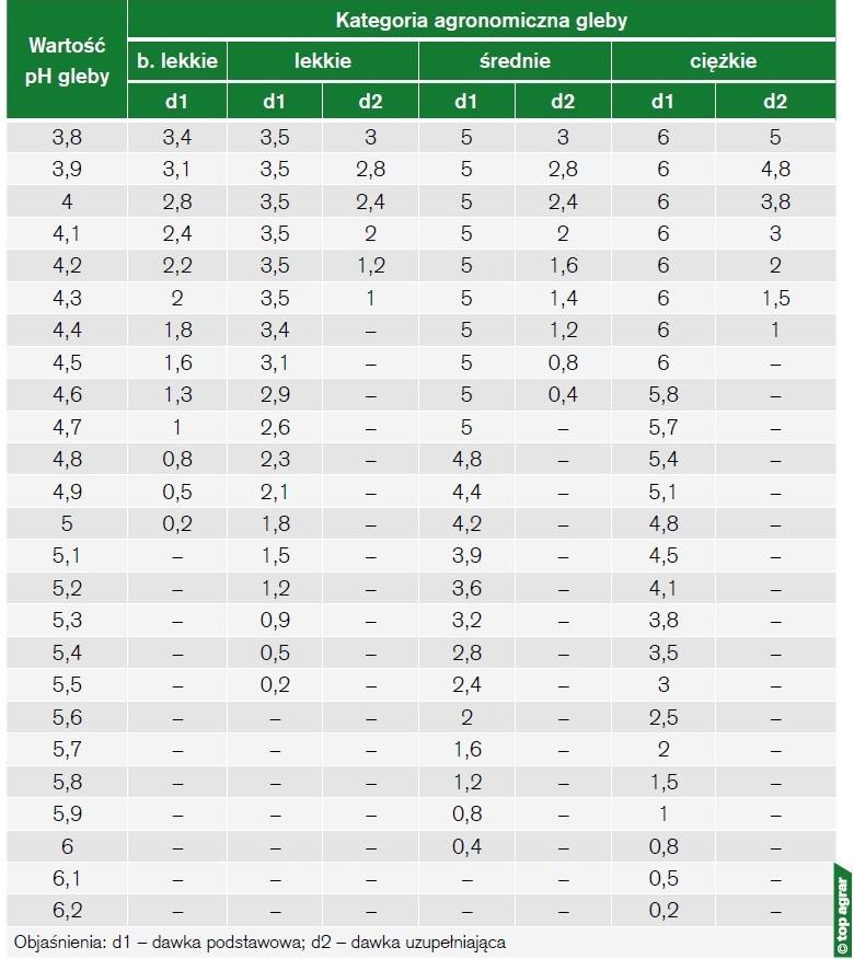 Wartości w tabeli 1. przedstawiają zalecane dawki wapna nawozowego na gruntach ornych różnych kategorii gleb, z podziałem na dawkę podstawową (d1) i uzupełniającą (d2). Dla gleb bardzo lekkich wystarczające jest zastosowanie dawki d1.