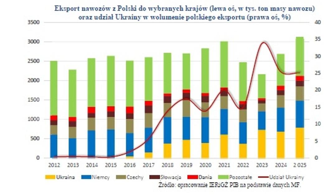 Najważniejszym kierunkiem wywozu była Ukraina. Jednak jej udział w eksporcie nawozów z Polski zmalał z 33,8% w 2023 r. do 25,1% w 2025 r.