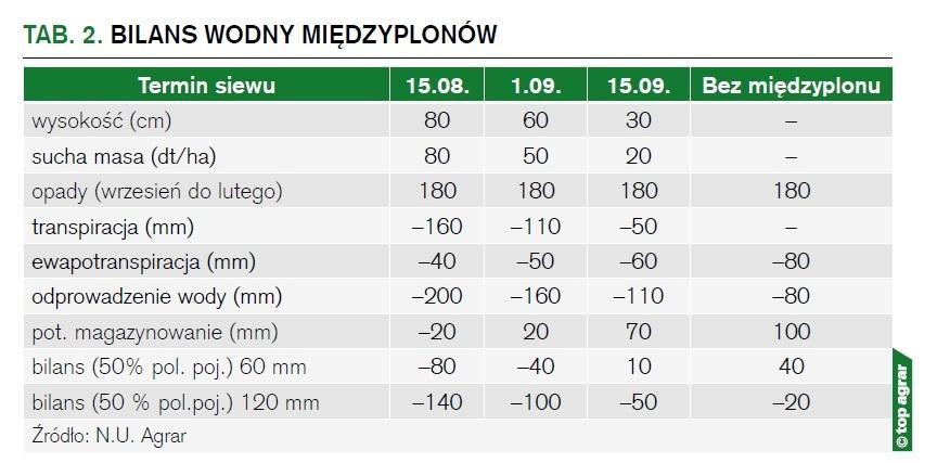 Skoro już o wodzie mowa, to warto sobie uświadomić, że wśród gatunków międzyplonowych są takie, które na budowę sporej masy zielonej potrzebują odpowiedniej ilości wody. Przyjmujemy, że na każde 10 cm wysokości międzyplonu rośliny zużywają ok. 12 l/m2 wody. Można by powiedzieć, że to niedużo, ale jeśli międzyplon wyrośnie do wysokości np. 70–80 cm, oznacza to, że zużył na to prawie 100 l/m2 wody! Tak wyrastający międzyplon korzysta najczęściej z wody opadowej, ale to i tak oznacza, że woda ta nie zostanie zmagazynowana w glebie do uzupełnienia jej braków, więc zwyczajnie nie będzie dostępna dla rośliny następczej. Jeśli zatem latem nie pada, to rośliny nie wyrastają zbyt wysokie, ale wyczerpują cenne zasoby wody glebowej.